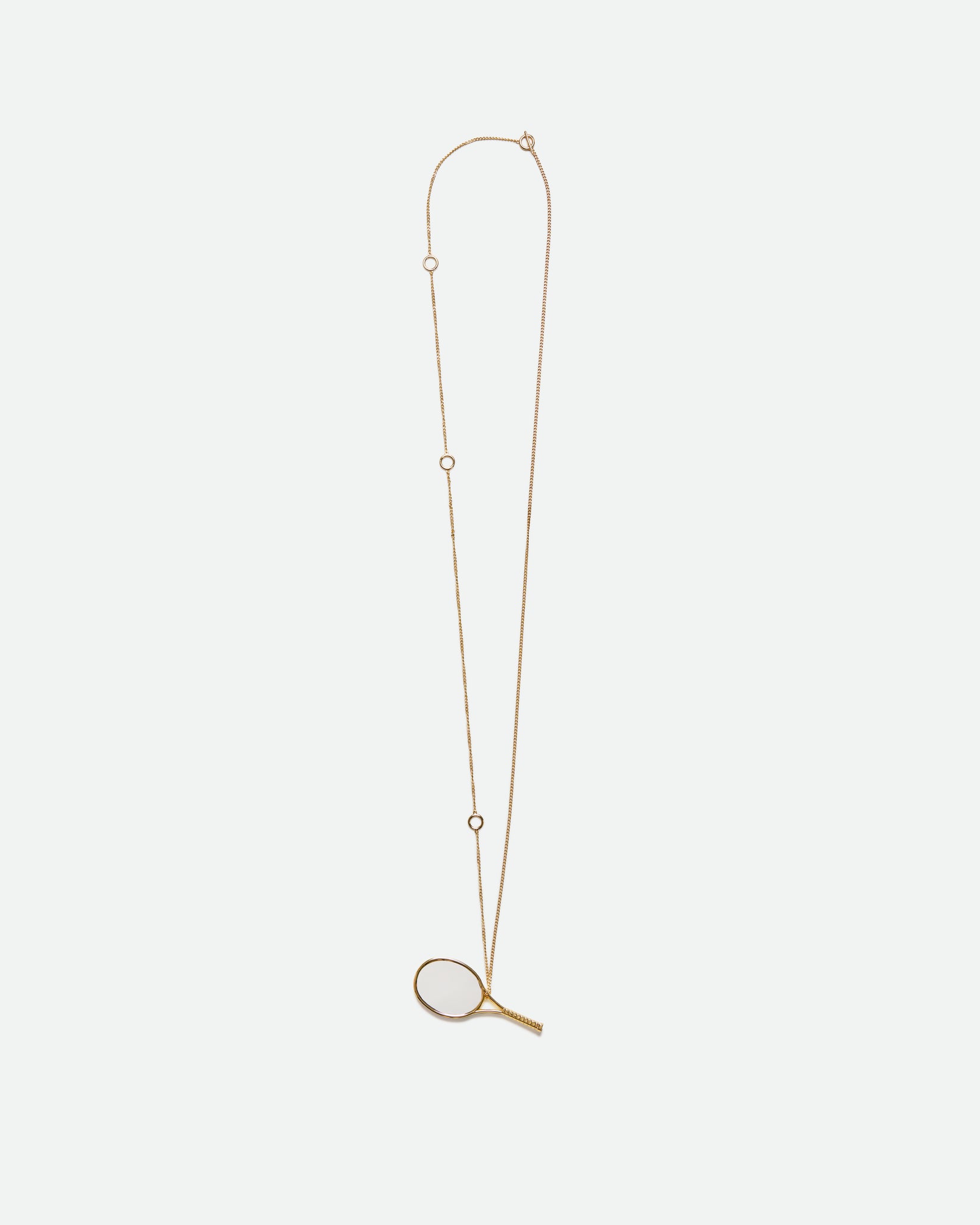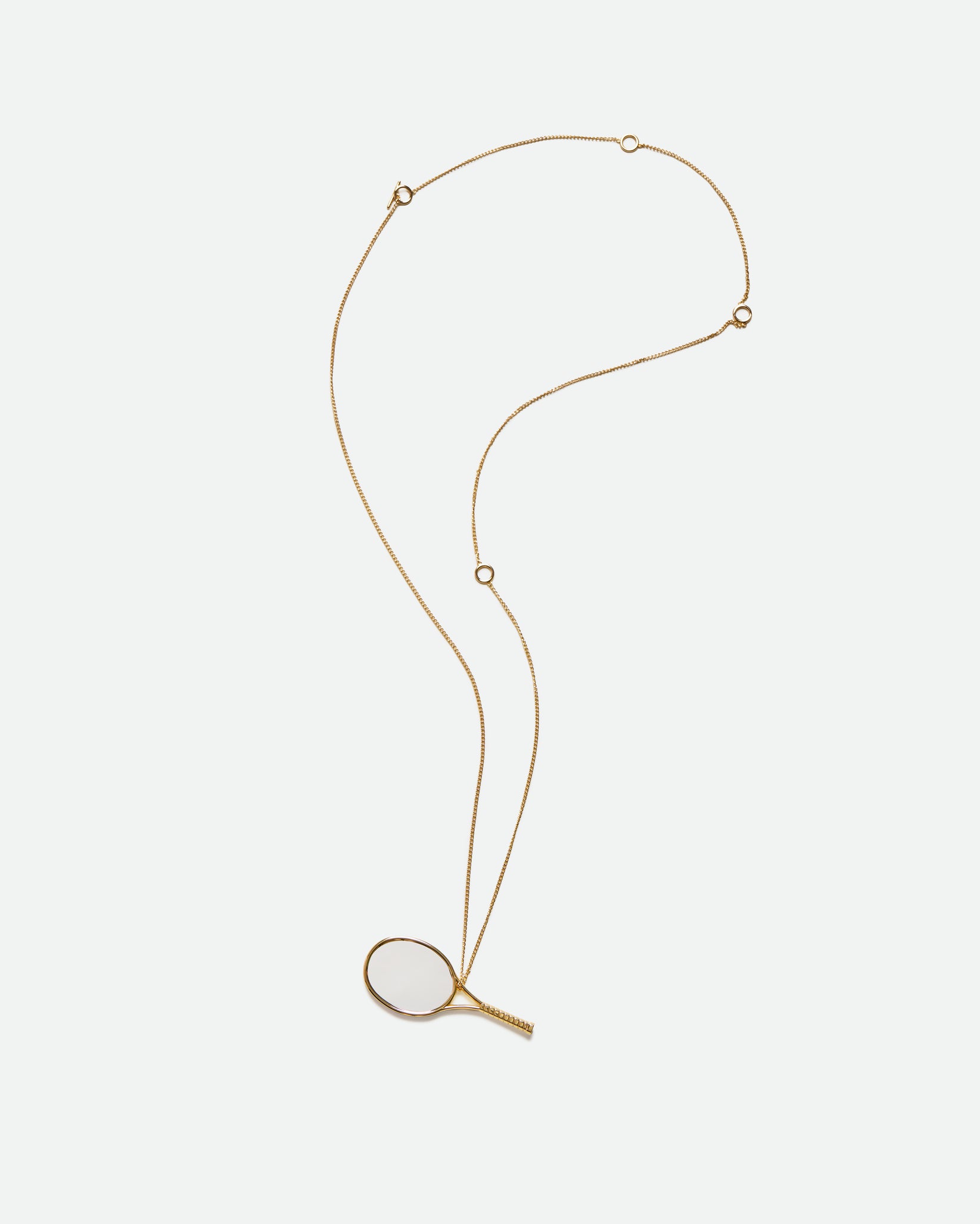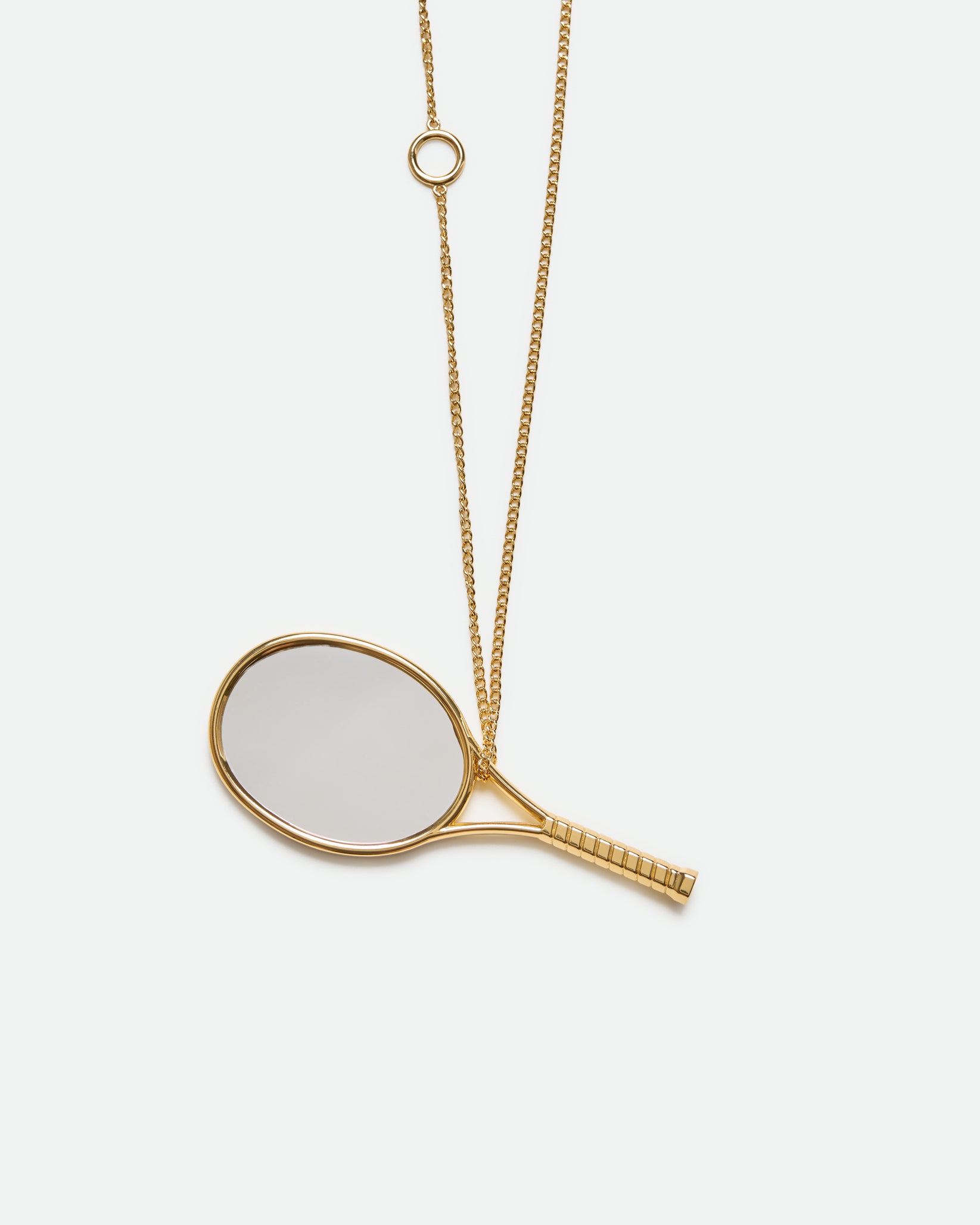 A tennis-racket-shaped mirror pendant on a long chain — both stylish and practical as a pocket mirror.