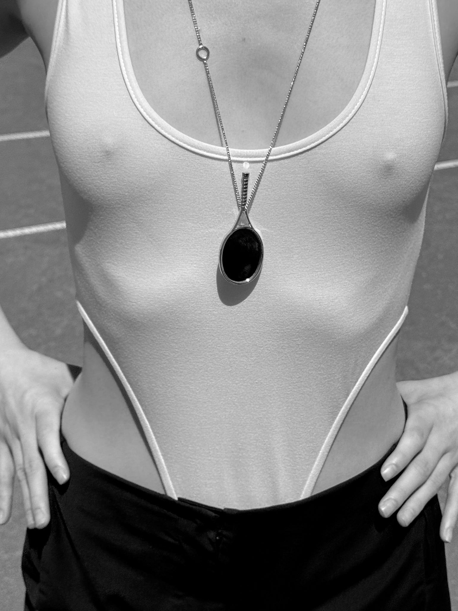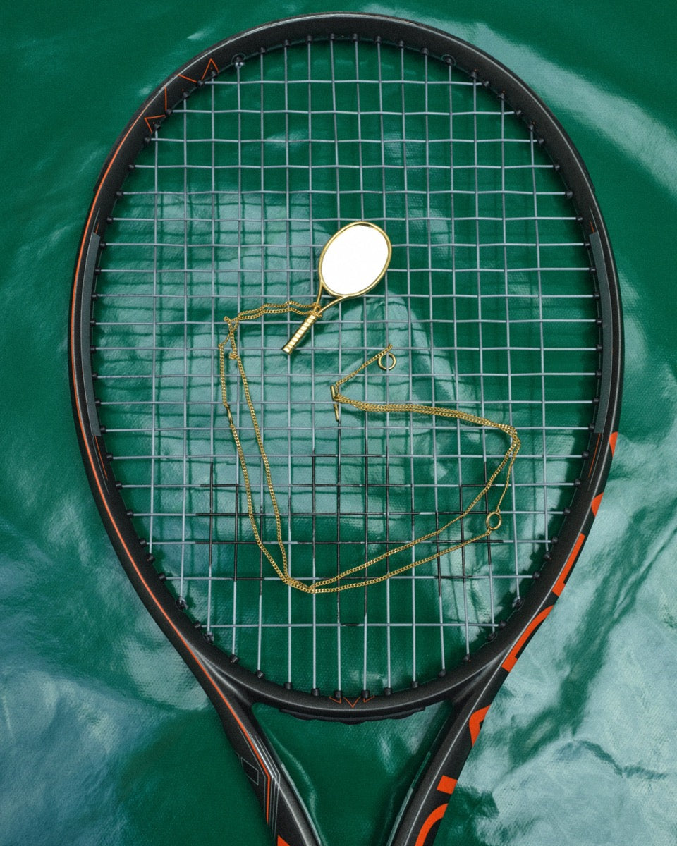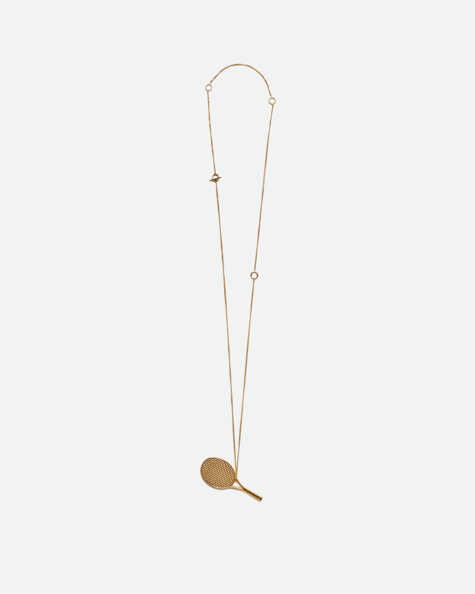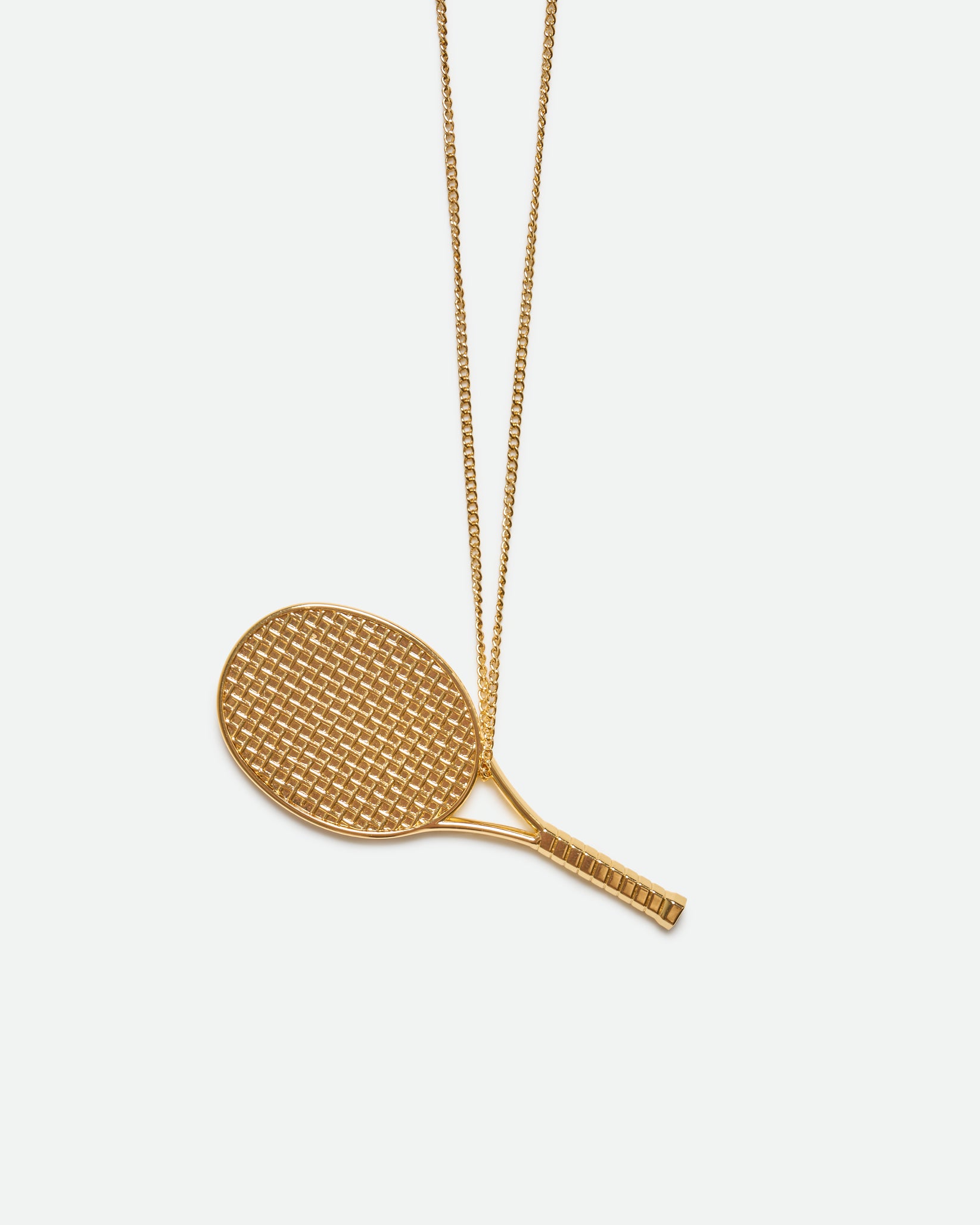 A tennis-racket-shaped mirror pendant on a long chain — both stylish and practical as a pocket mirror.