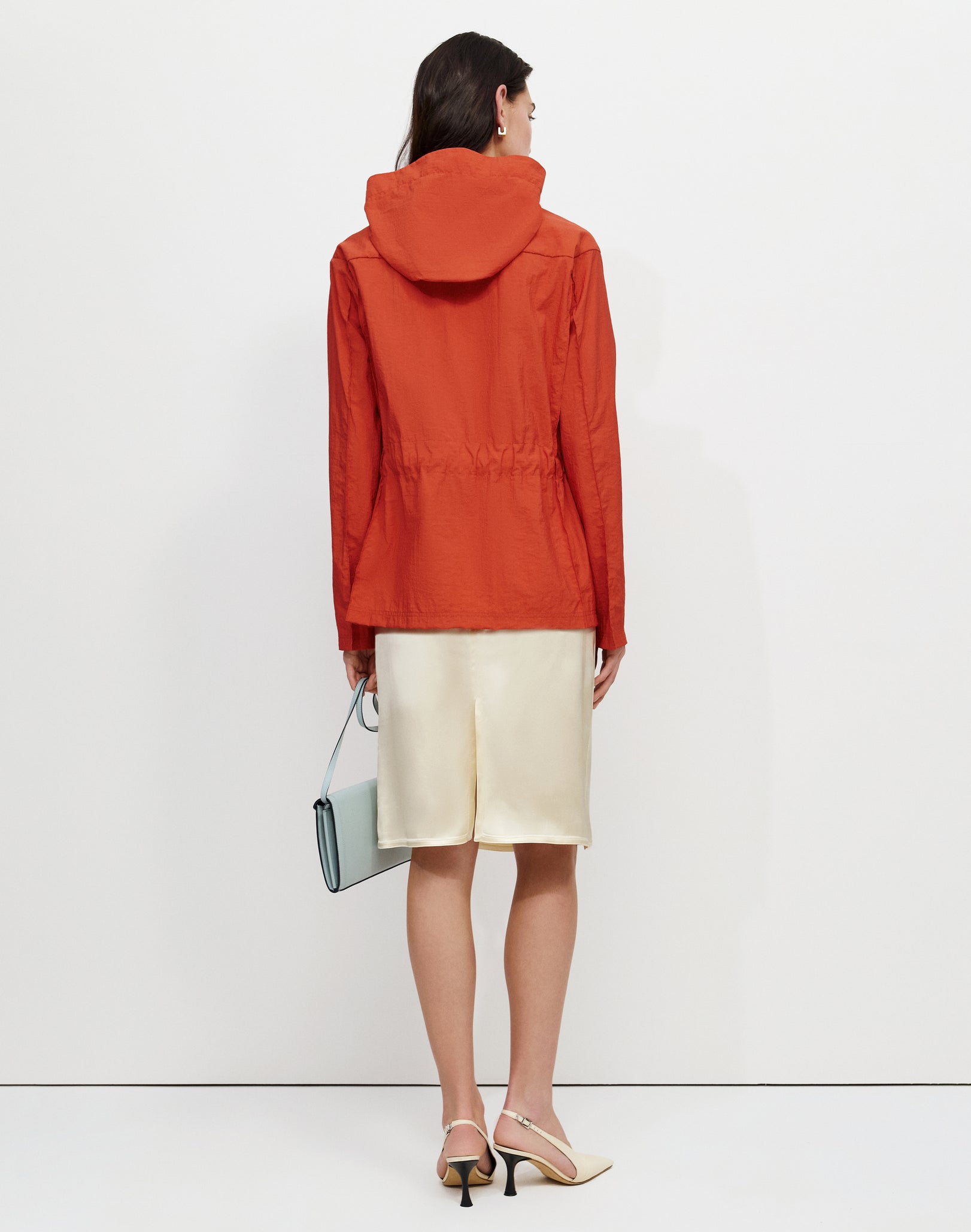 Lightweight hooded jacket with zip closure and pocket at front.