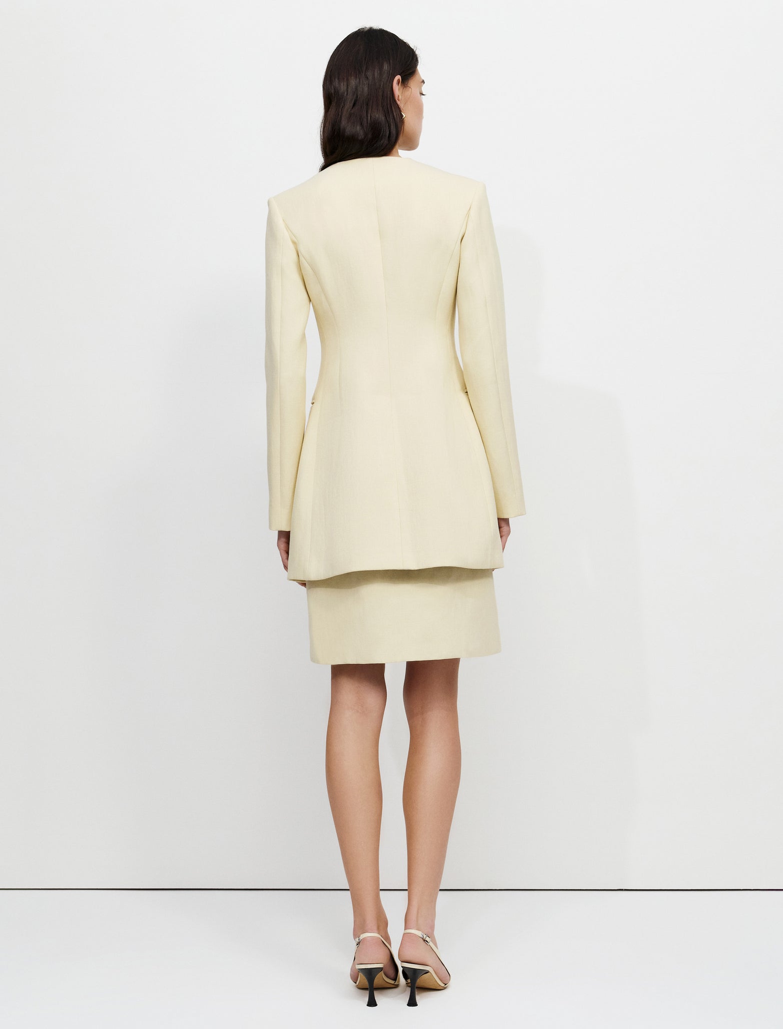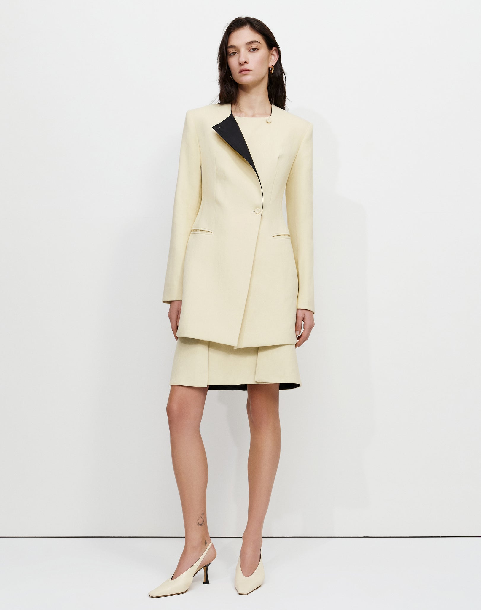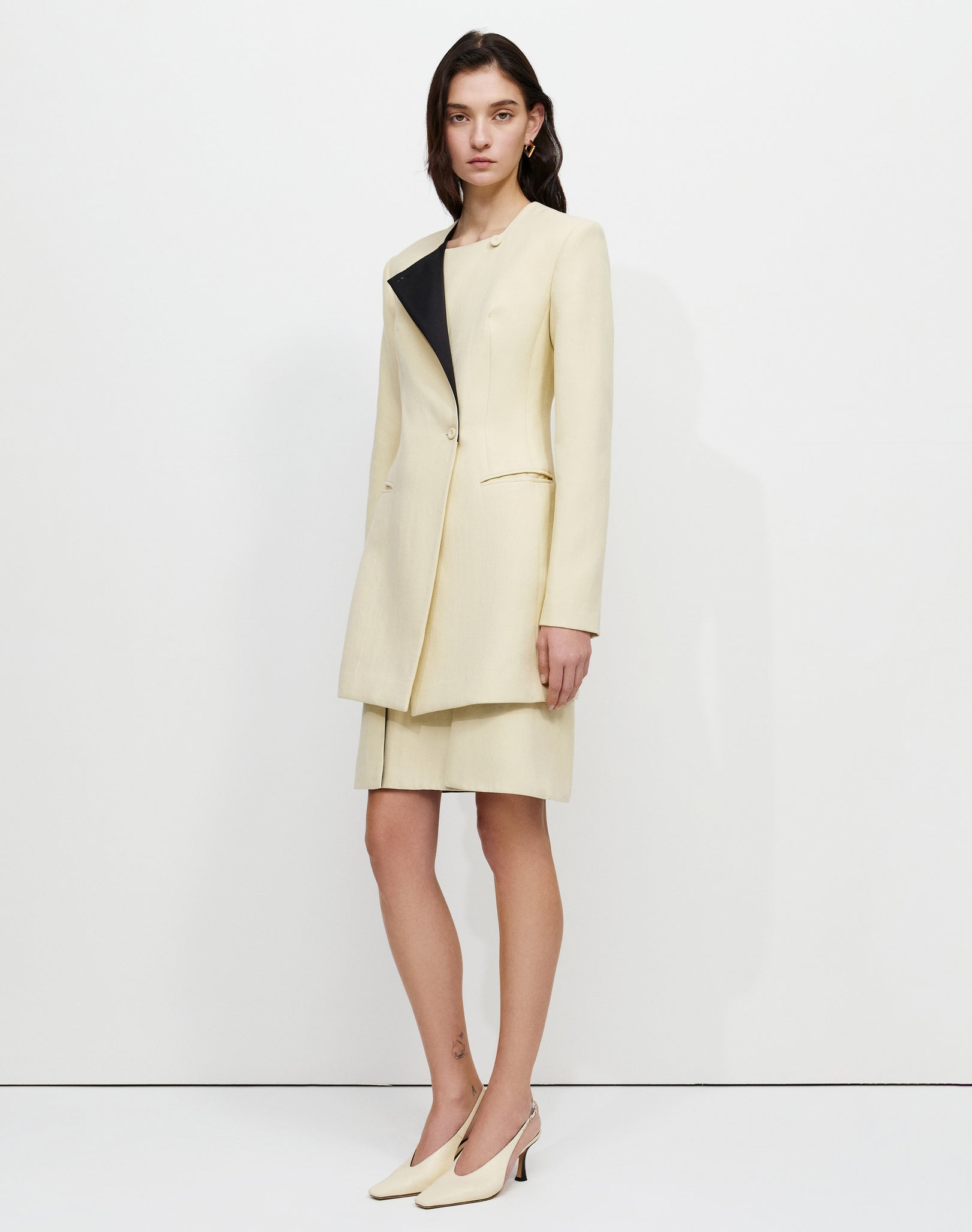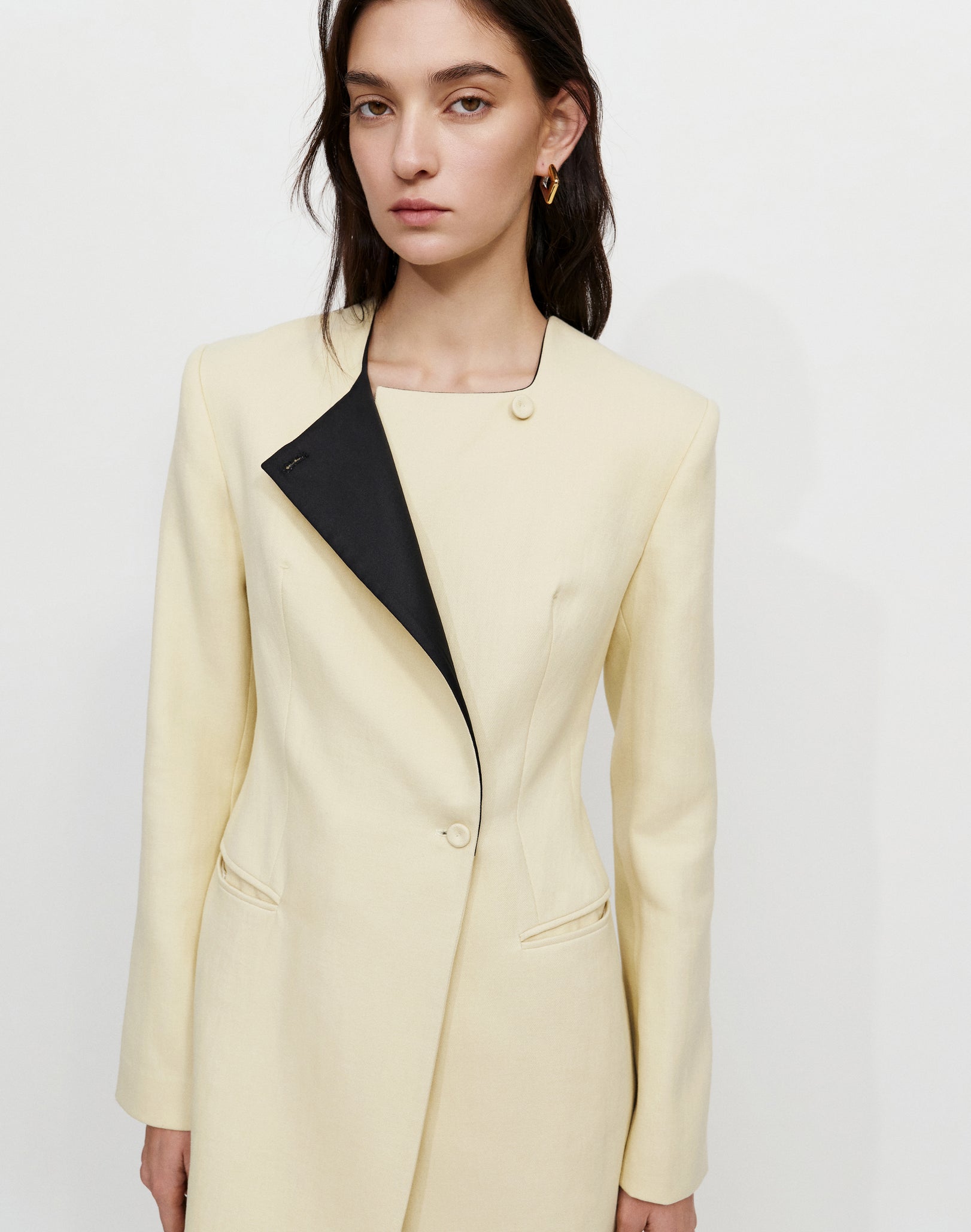 Close-fitted long jacket with padded shoulders, front button closure and a contrast side lapel.