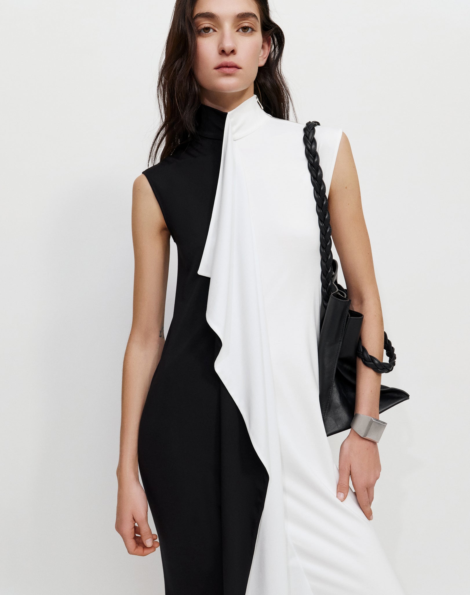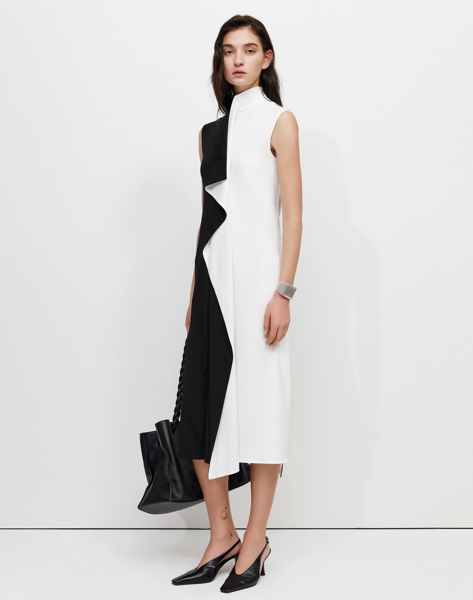 Two-tone turtleneck sleeveless midi dress, cut from two contrasting square panels, creating a sculptural front flowing drape.