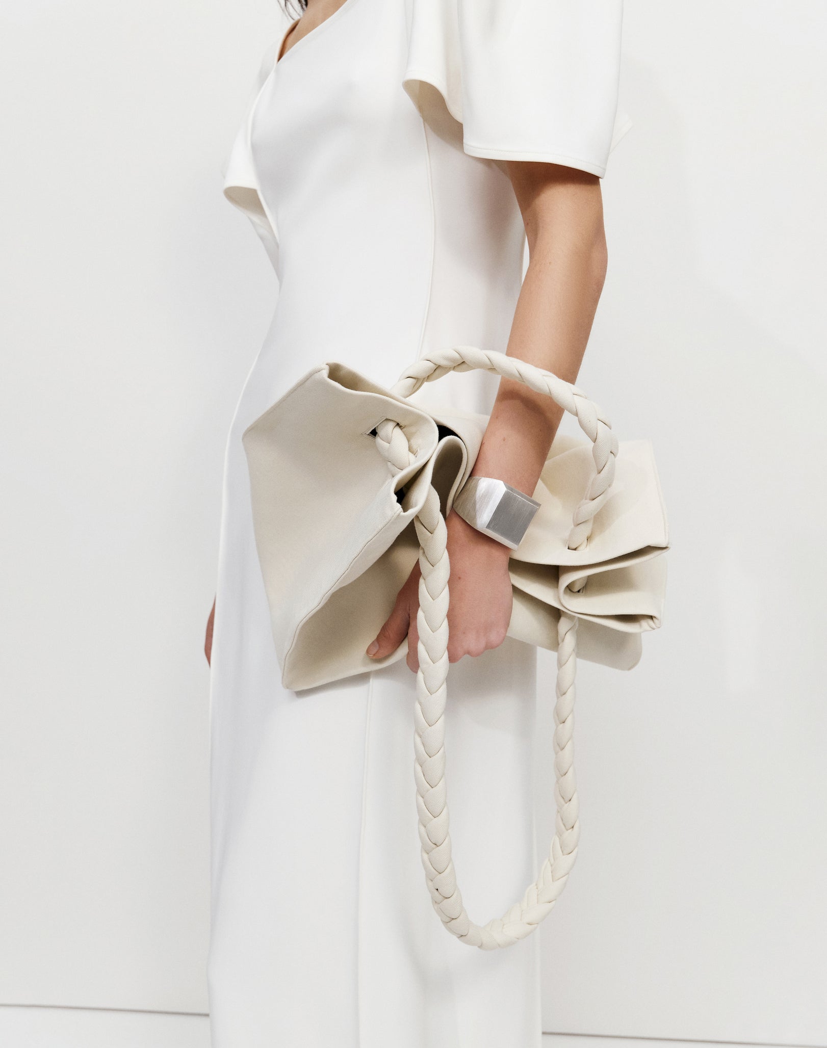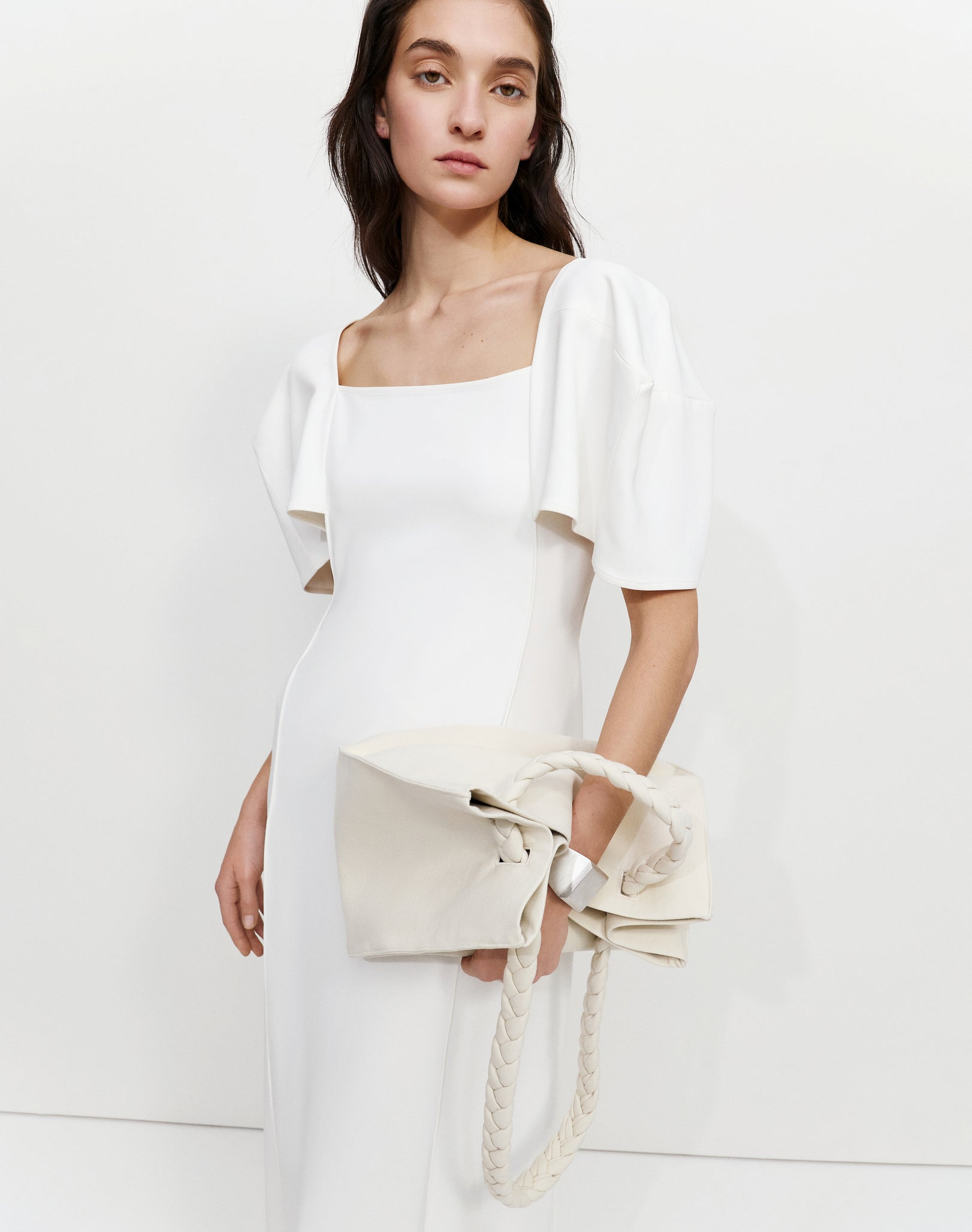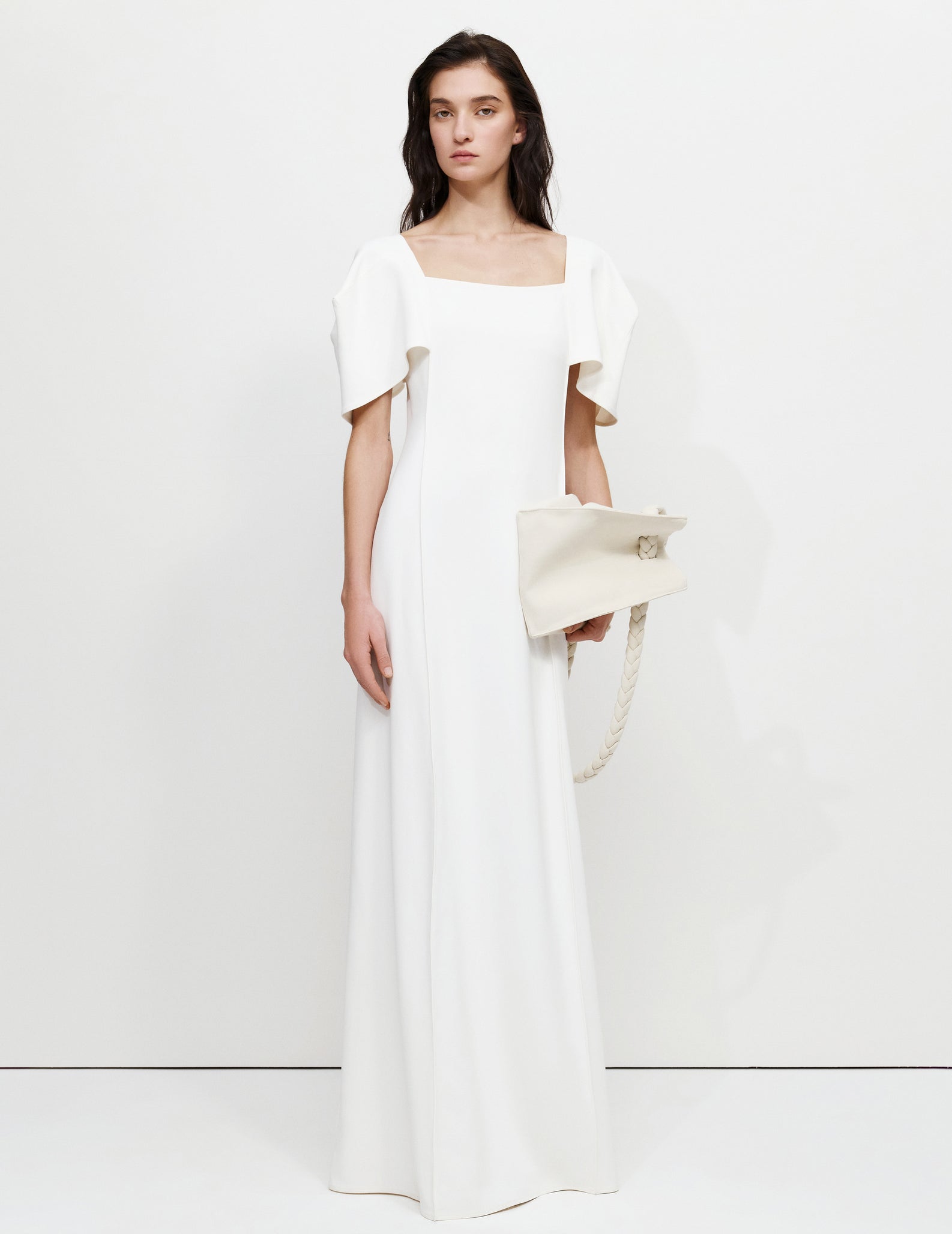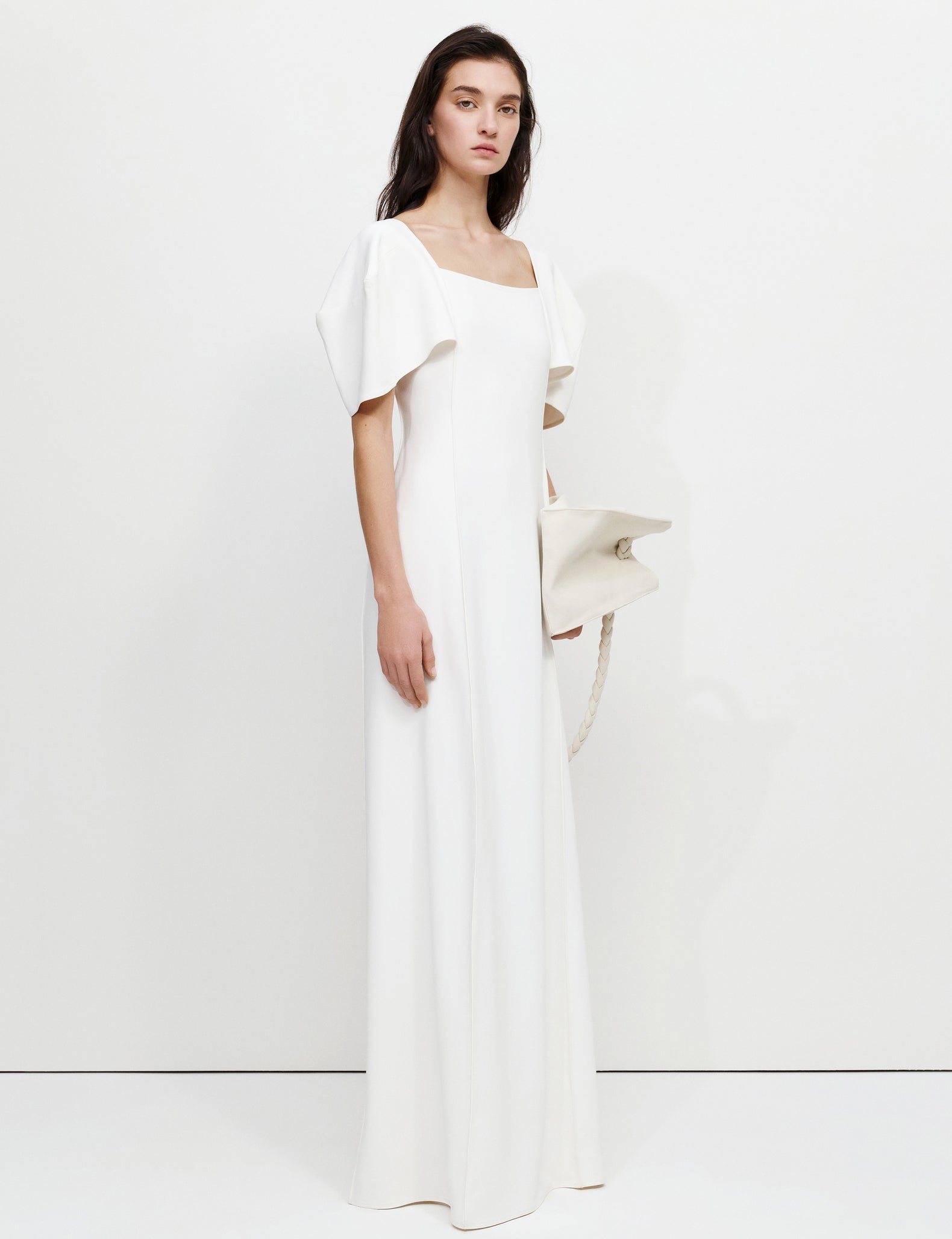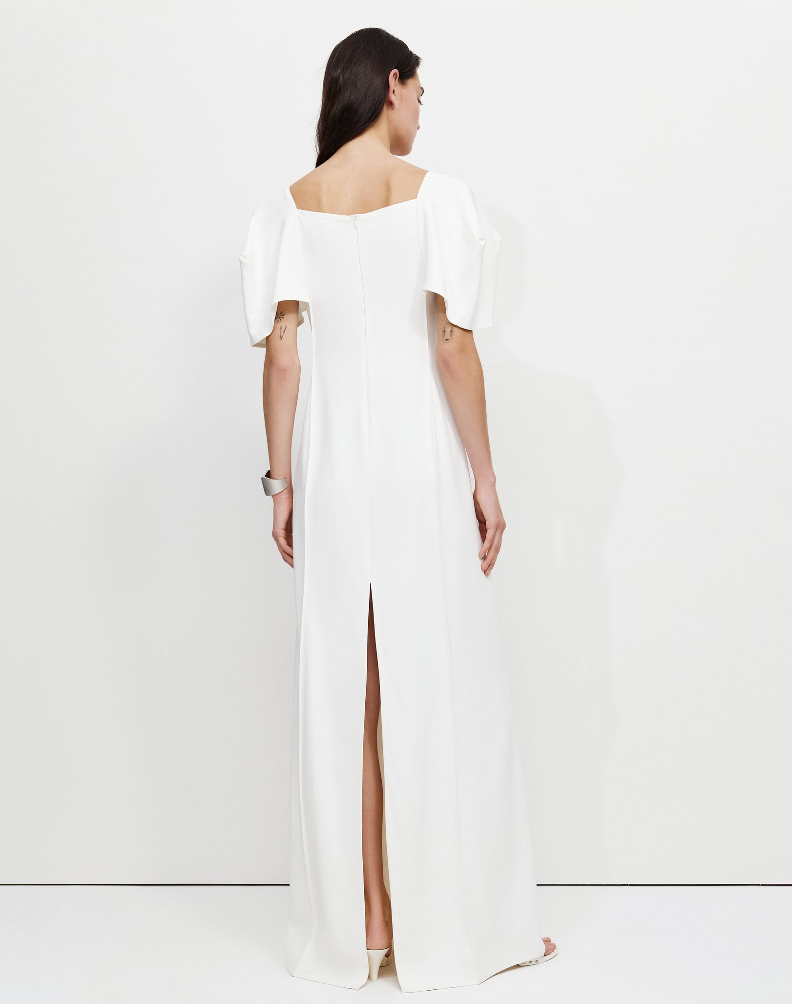 A column maxi dress with dramatic voluminous cube-shaped sleeves.