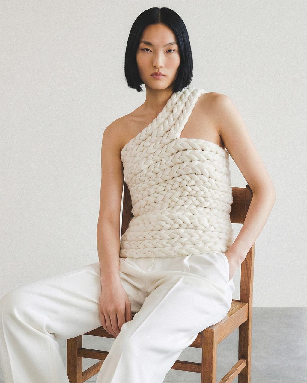 This handmade comfortable art piece significantly elevates your minimalist look. Asymmetrical braid-inspired top featuring a layered, wrap-around design that contours the body. Handcrafted by artisans.