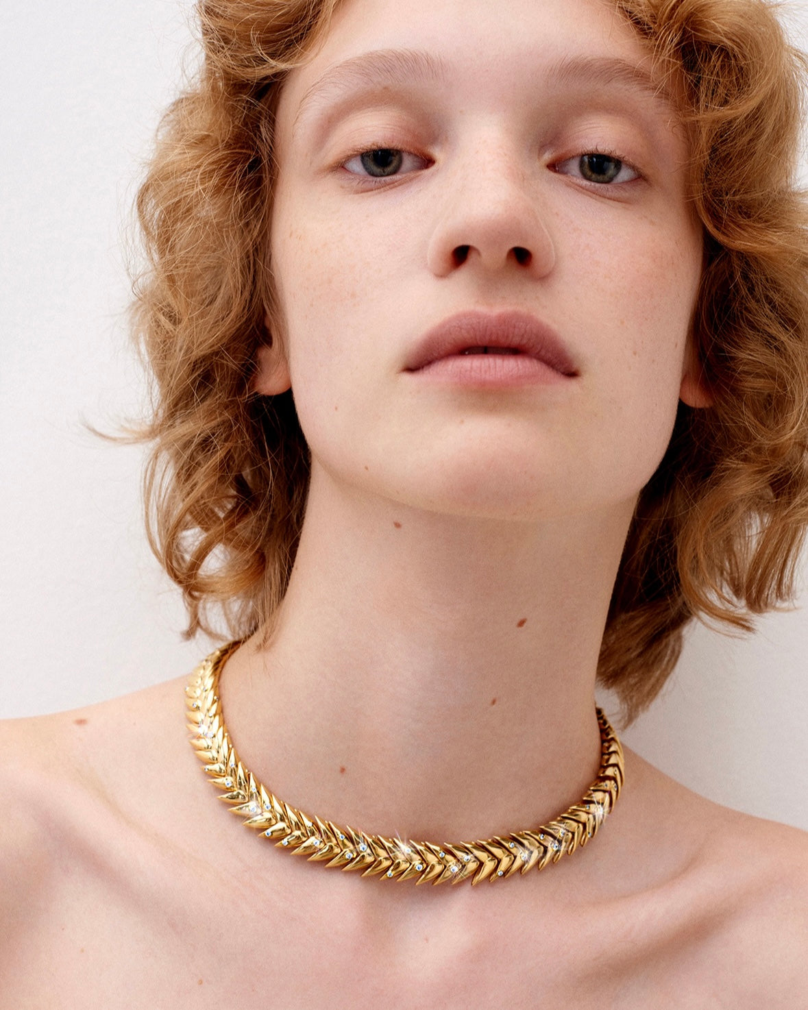 BEVZA introduces the iconic "Dew" necklace shaped like wheat spikes in a new version, adorned with crystals symbolizing dew. The necklace crafted with meticulous attention to detail, with each element designed to evoke associations with drops of dew on wheat spikes at dawn, symbolizing renewal and hope.